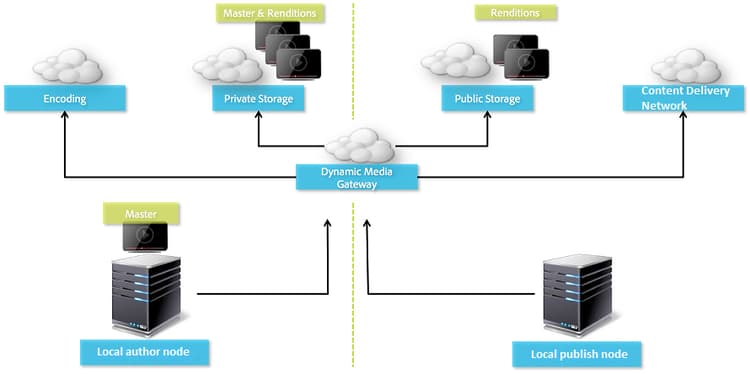 Hybrid publishing and delivery is a core feature of the Dynamic Media addition to Adobe Experience Manager. Hybrid publishing lets you deliver Dynamic Media assets, such as images, sets, and video, from the cloud instead of from the Experience Manager publish nodes.
