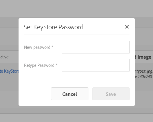 replication. (See step 7 in Setting Up Authentication.) - Key Store Password - The KeyStore password that was created when you tapped Create KeyStore. Adobe does not provide this password. See step 5 of Setting up Authentication.