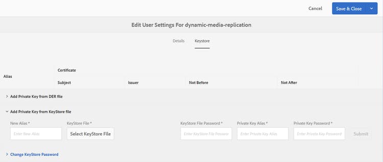 On the Edit User Settings For dynamic-media-replication page, expand the Add Private Key from KeyStore file area and add the following (see the images that follow):