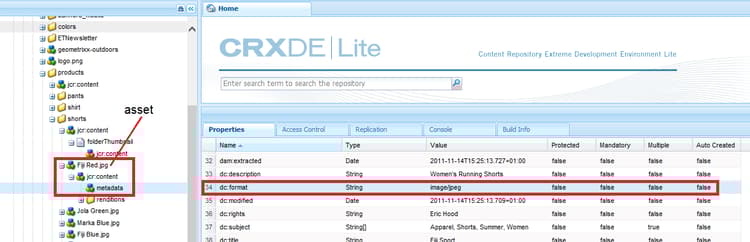 content > dam > <locate_your_asset> > jcr:content > metadataand then in the table, locatedc:format.The following graphic is an example of an asset’s path to
