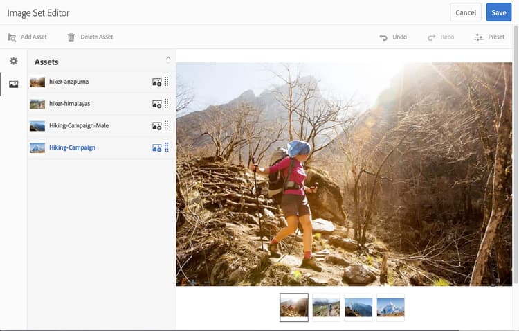 1. In Experience Manager, select the Experience Manager logo to access the global navigation console, then go to Navigation > Assets. Navigate to where you want to create an Image Set, then go to Create > Image Set to open the Image Set Editor page.