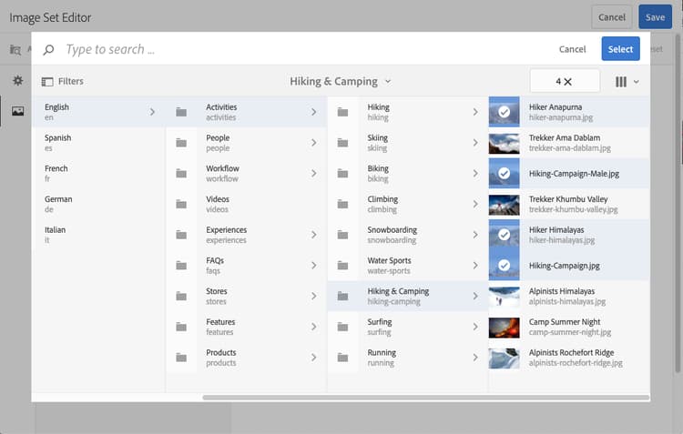 Select the assets that you want to include in your Image Set. Selected assets have a checkmark icon over them. When you are finished, near the upper-right corner of the page, select Select.