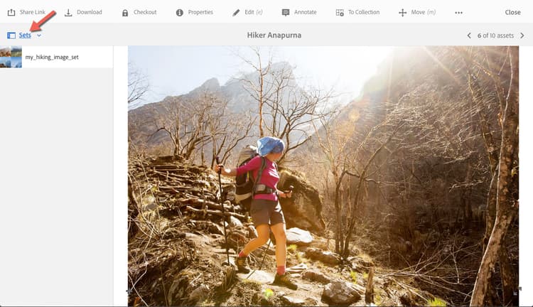 • From a member image of any set. Select the Sets menu to display the sets that the asset is a member of.