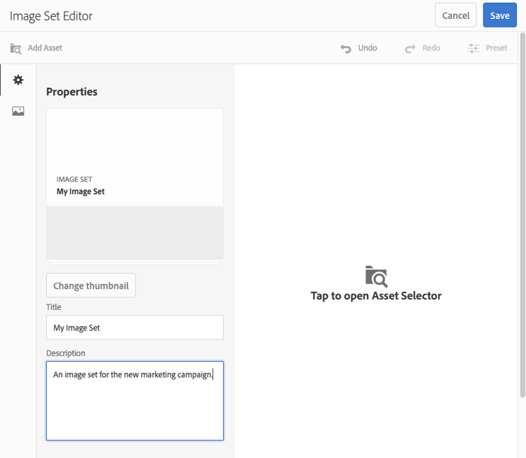 To create an Image Set in Assets, go to Create > Image Sets. Then, add images and select Save.