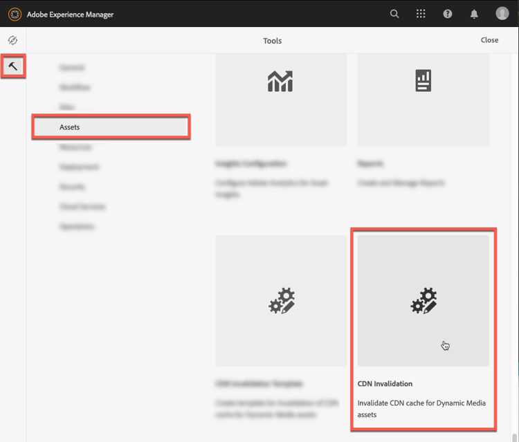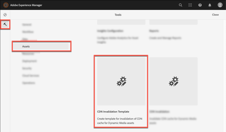 In Experience Manager as a Cloud Service, select Tools > Assets > CDN Invalidation.