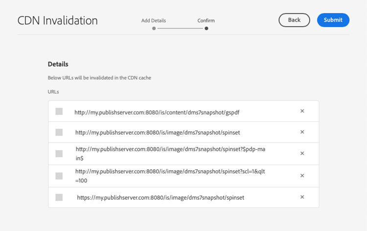 spinset. When you navigate to Tools > Assets > CDN Invalidation, it results in the following five generated URLs in the CDN Invalidation - Confirm user interface: