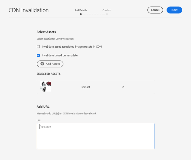 Use this option with Invalidate asset associated image presets in CDN, or Invalidation based on template, or both.Add URL Manually add or paste full URL paths to Dynamic Media assets whose CDN cache you want to invalidate. Use this option if you did not create a CDN Invalidation Template in Part 1 of 2: Creating a CDN Invalidation template, and have only a few assets to invalidate.