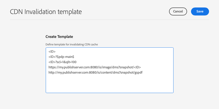 table 0-row-2 1-row-2 2-row-2 Scenario Option I have already created a CDN invalidation template in the past using Dynamic Media Classic. The Create Template text field is pre-populated with your template data. In such case, you can either edit the template, or continue to the next step. I have to create a template. What do I enter? In the Create Template text field, enter an image URL (including image presets or modifiers) referencing <ID>, instead of a specific image ID as in the following example:https://my.publishserver.com/is/image/company_name/<ID>?$product$