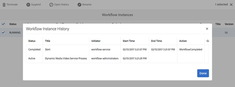 From the Workflow Instances area, you can also suspend, terminate, or rename workflows. See Administering workflows for more information.