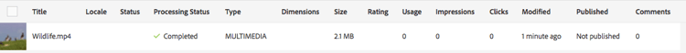 - In list view, video encoding progress displays in the Processing Status column. If there is an error, this message displays in that same column.