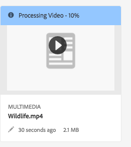 - In card view, video encoding progress displays on the asset by percent. If there is an error, this information also displays on the asset.