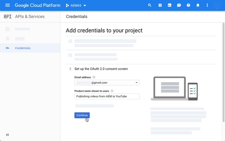 On the Add credentials to your project page, step 3, under the Set up the OAuth 2.0 consent screen heading, select the Gmail email address that you are currently using.