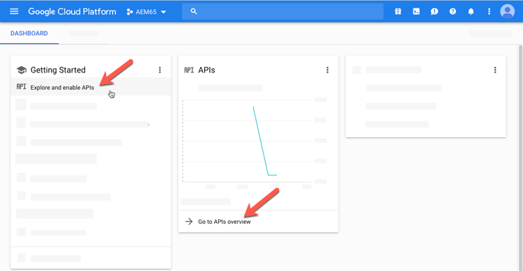 - On your project’s Dashboard, in the Getting Started card, select Explore and enable APIs.