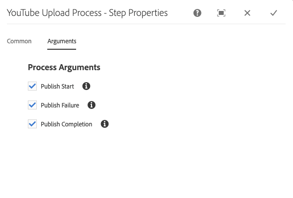 In the YouTube Upload Process - Step Properties dialog box, select the Arguments tab.
