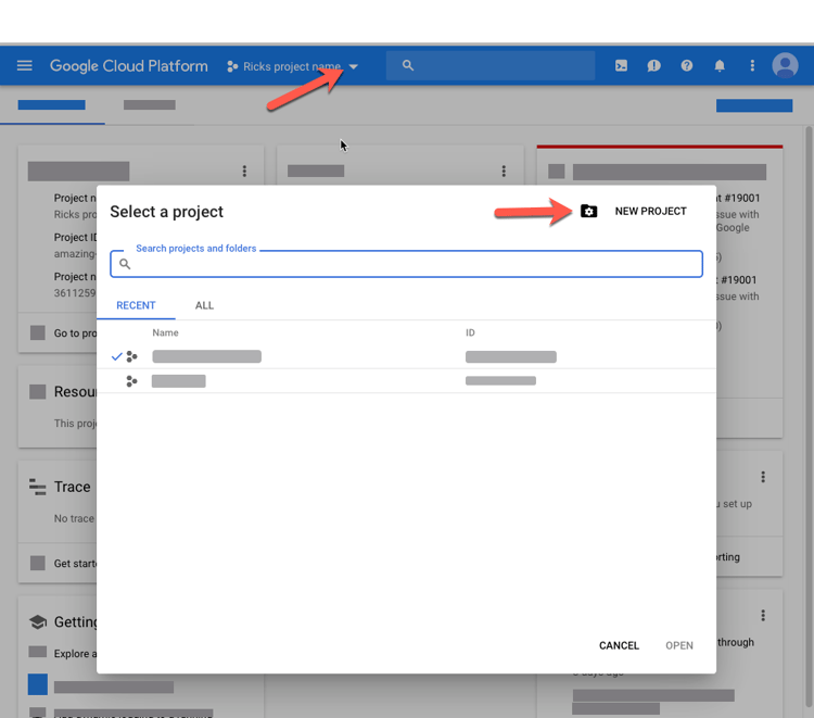 On the Dashboard page, to the right of Google Cloud Platform, click the Project drop-down list to open the Select a Project dialog box.