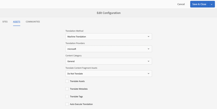 4. Translate Content Fragment Assets - Check this to translate assets associated with Content Fragments.
