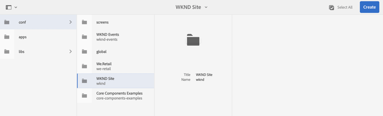 2. Navigate to where you wish to create the configuration in your content structure. This is often based on a particular project or can be global.