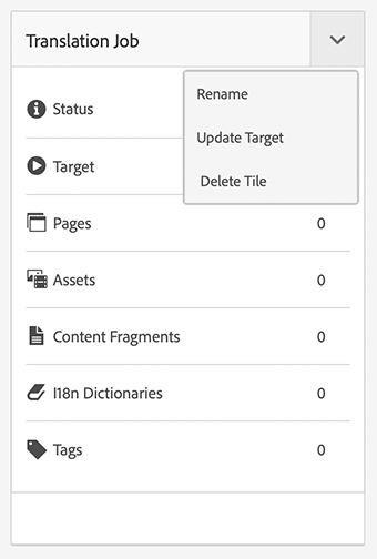 On the card of the new translation job, click the chevron button at the top of the card, and select Update Target to define the target language of the new job.