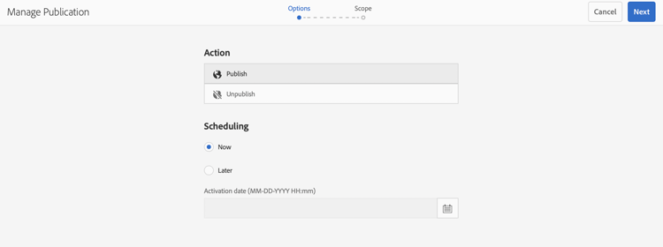 - In the Manage Publication window, make sure that Publish is automatically selected under Action and that Now is selected under Scheduling. Click Next.