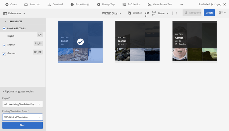 You may notice that the statistics listed on the new card (number of assets and content fragments) is different. This is because AEM recognizes what has changed since the last translation and only includes the content that must be translated. This includes re-translation of updated content and the first-time translation of new content.