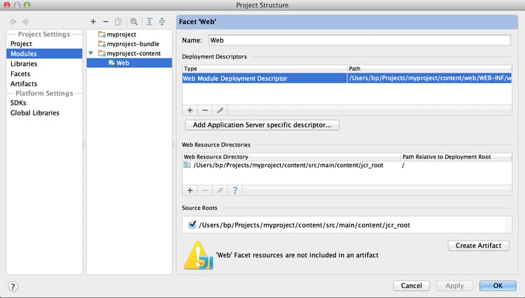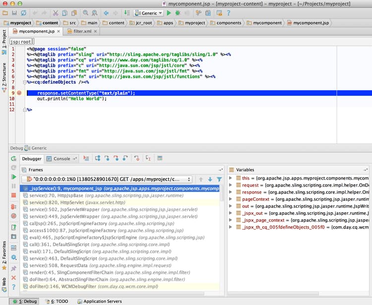 IntelliJ IDEA must understand where to find the JSPs for debugging. Because IDEA cannot interpret the content-package-maven-plugin settings, it must be configured manually.