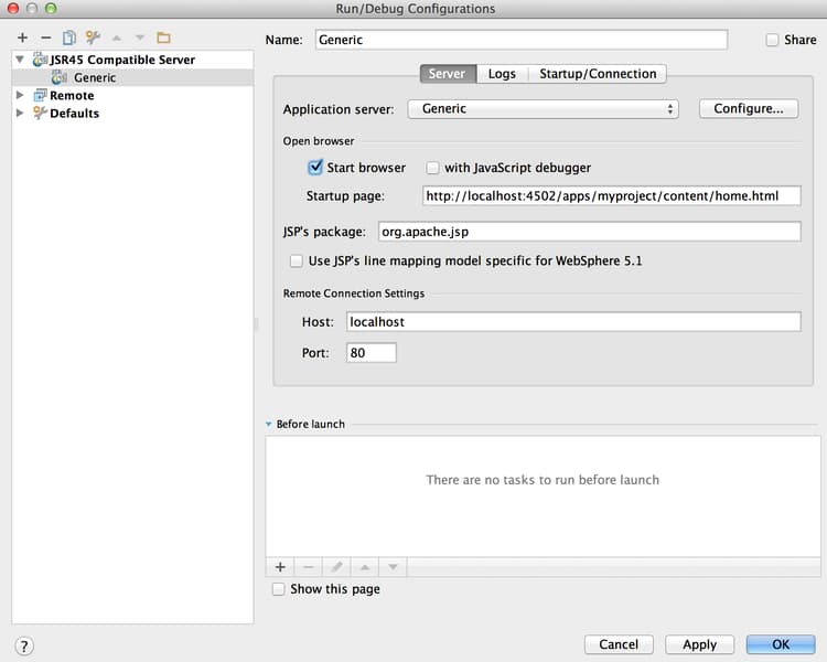 - In the configuration dialog, select Configure next to Application Server and configure a Generic server