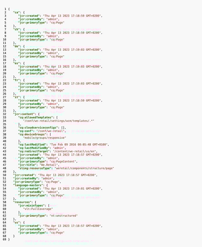 By default, AEM stores system metadata, such as jcr:createdBy or jcr:lastModifiedBy as node properties, next to regular content, in the repository. Depending on the configuration and the access control setup, in some cases this could lead to exposure of personally identifiable information (PII), for example, when such nodes are rendered as raw JSON or XML.