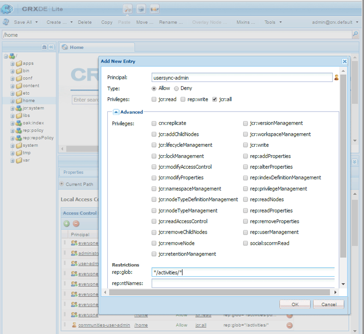 Allow jcr:allwith restrictionrep:glob=*/activities/*