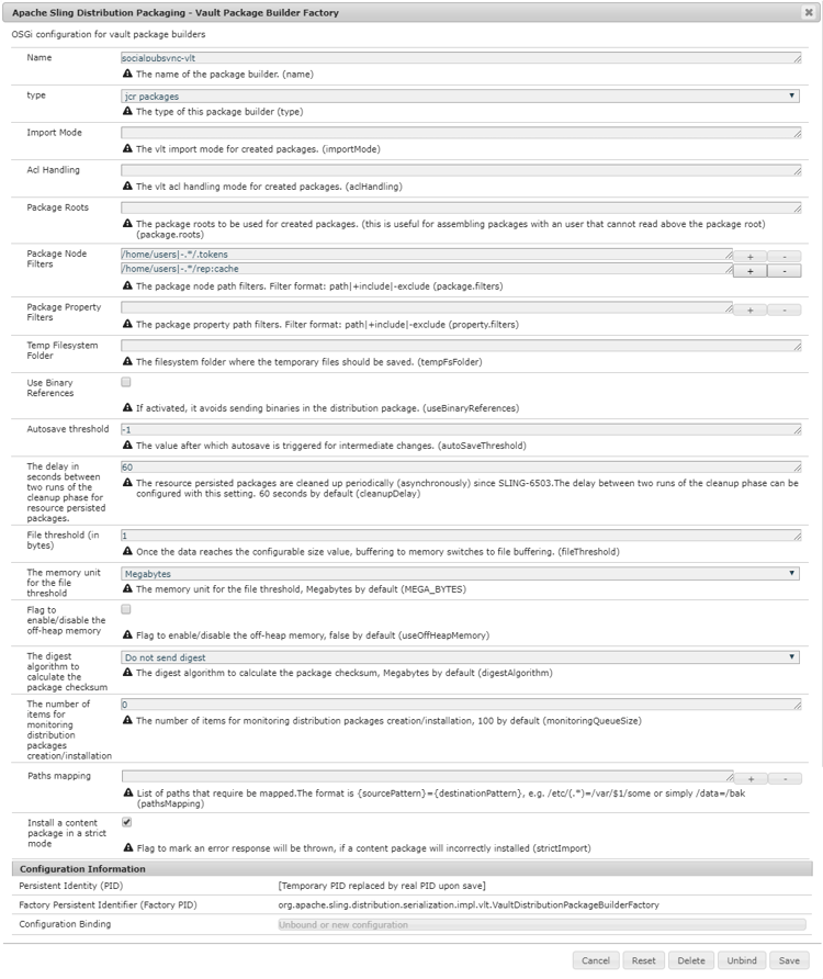 Apache Sling Distribution Packaging - Vault Package Builder FactoryBuilder name: socialpubsync-vlt