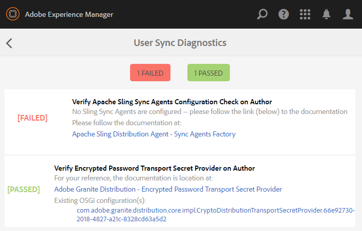 Included in the list is a URL for each Publish instance that runs the diagnostics for that instance. The url param syncUser is appended to the diagnostics URL with its value set to the authorized sync user created in Step 2.
