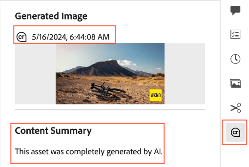 Cr pinfrom the rightmost pane. The Content Credentials tab displays the following information about the asset.- Generated Image: Date and time in which Content Credentials were applied.
