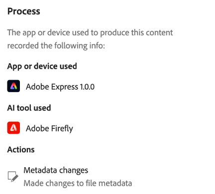 - Content Summary: Indicates whether the asset is partially or completely generated by AI, or how it was edited.