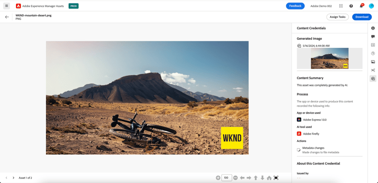 Adobe Experience Manager Assets now supports Content Credentials, enabling users to see Content Credentials directly within the Assets view of AEM. When looking at the asset details, any image with Content Credentials (such as those created with GenAI services) shows the manifest details in a dedicated panel. If the asset is downloaded, published, or shared, the Content Credentials remain intact with the asset.