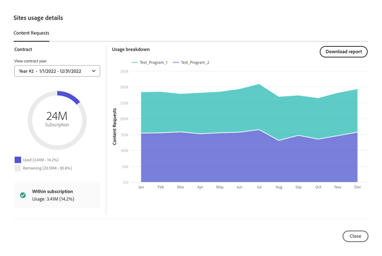 If you would like additional insights into the content request volume shown in the License dashboard, your Adobe team can provide a report that shows the top volume drivers of content requests. Reach out to your Adobe team or to Adobe Customer Support to request a top usage report.