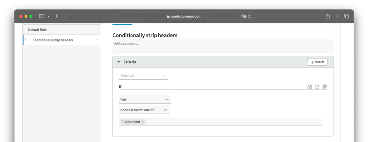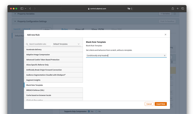 Select “Blank Rule Template”, set a name such as “Conditionally strip headers” and click “Insert Rule”.