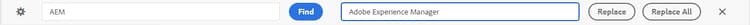 The Find and Replace feature is available in Author and Source view modes. The Find and Replace text bar appears at the bottom of the topic editing area. You can use the shortcut keys CTRL+F to invoke the Find and Replace bar.