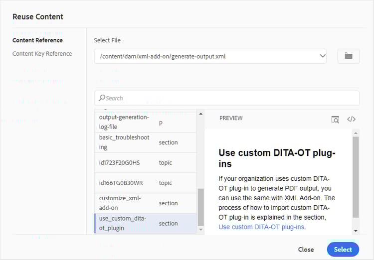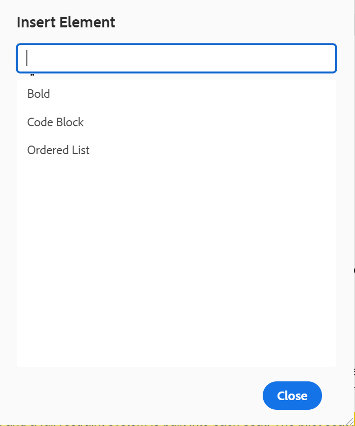 Elements List: As an administrator, you can control the list of elements that an author can insert using the Insert Element pop-up, and also define the display name for the element. The Elements List setting allows you to specify the element’s name as per DITA specifications and a label that you want to use instead of the DITA defined element name: