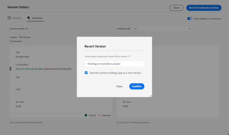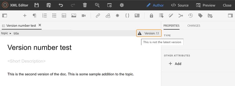The Version History feature in the Web Editor allows you to check the available versions of your DITA files, compare them, and revert to any version from the editor itself.