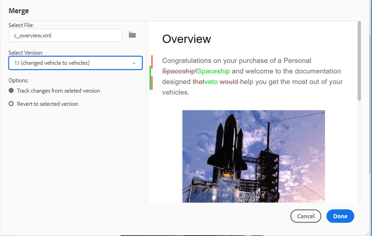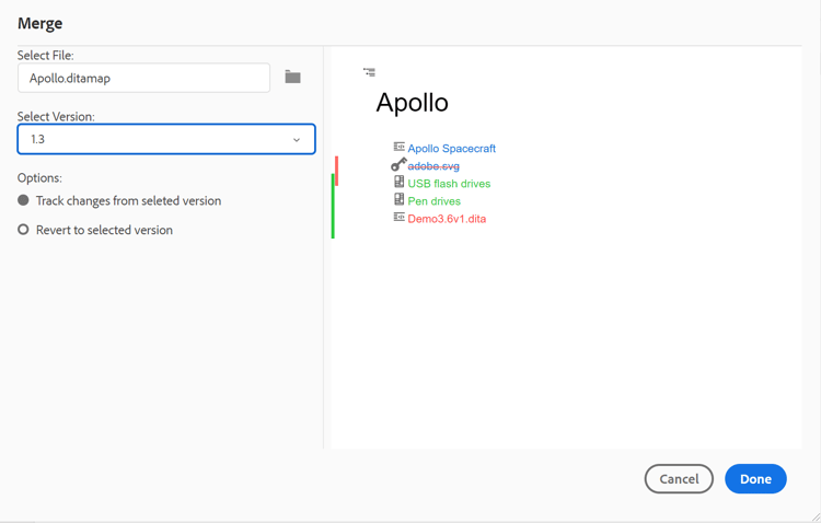 When you work in a multi-author environment, it becomes difficult to track what changes the other authors have made in a topic or map. The Merge feature gives you more control over not only viewing the changes, but also what changes are retained in the latest version of the document.