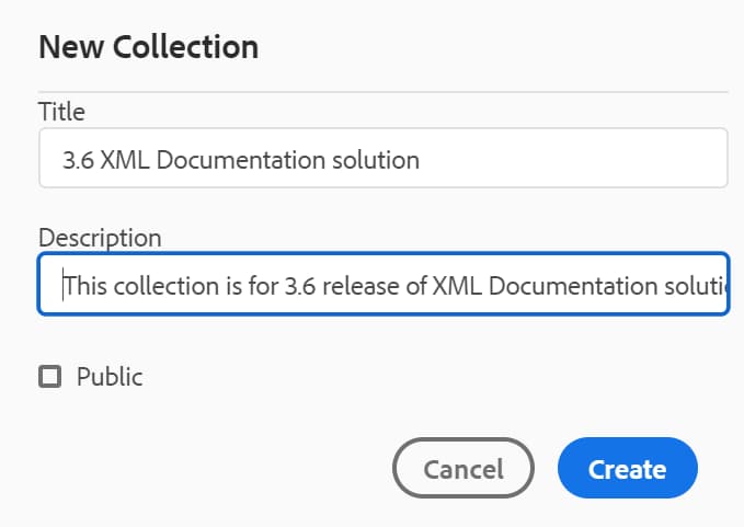 Enter a title and description for the favorite collection that you want to create. If you select Public, then this favorite is shown to other users as well.