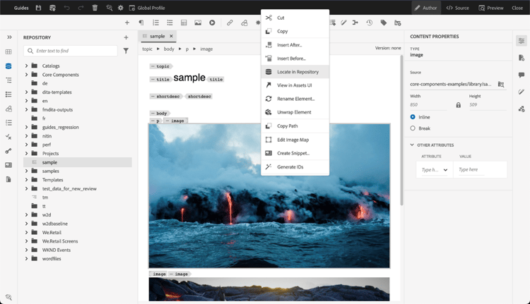 Select a map and press Enter or double-click to open it in the Map View. For more details, see the Map View feature description in the Left Panel section. Select a topic and press Enter or double-click to open it in the Content editing area. Being able to navigate and open a file directly from the Web Editor saves time and increases productivity.