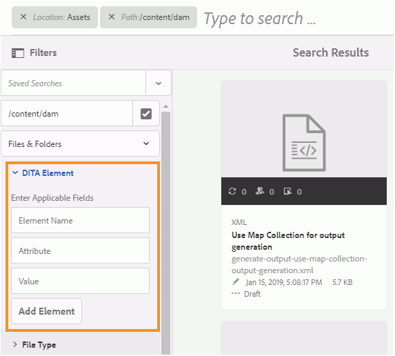 When you access the Filters option in the Assets UI, you will get the DITA Element search filtering option.