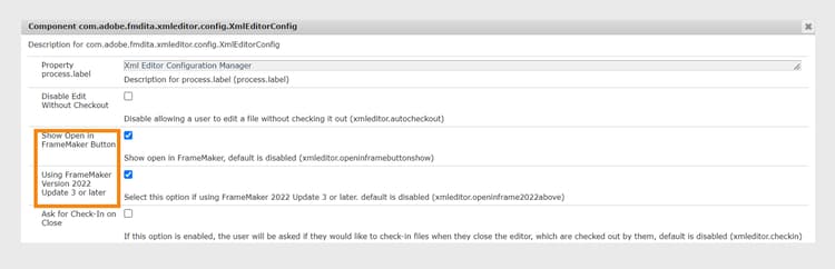 If you are using version 4.6 and FrameMaker 2022 September release - Update 3, you must enable the FrameMaker Version 2022 Update 3 or above config for your users to pass on the Experience Manager Guides server details to FrameMaker. By default, it is disabled.