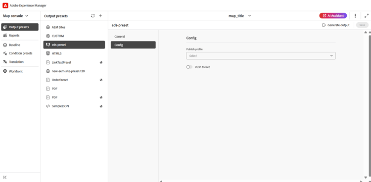 The sections below outline each step in sequence and explain how to set up EDS (Beta) publish profile, configure an output preset, and generate output using EDS (Beta) in Experience Manager Guides.