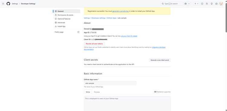 Your app is now ready. You are redirected to the Settings page of your GitHub App.