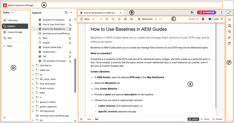 This article provides you an overview of the Editor interface, and the various features that are available in the Experience Manager Guides Editor.