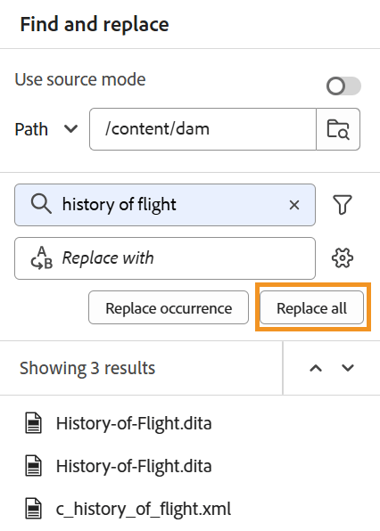note note NOTE To enable thenReplace all icon, your Folder profile administrator or System administrator must select the option Enable Replace All under the General tab in Workspace settings (appearing as Settings for On-Prem). If errors occur during the replace operation, those files will be skipped due to XML parsing issues or DITA-related errors. {width="350"}