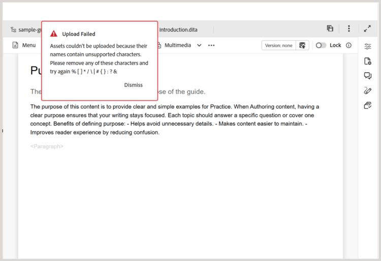 Upload assets: Upload a file from your local system to the selected folder in Adobe Experience Manager repository. You can also drag-and-drop files from your local system onto your current working topic. This is very useful if you want to insert images from your local system into your topic.