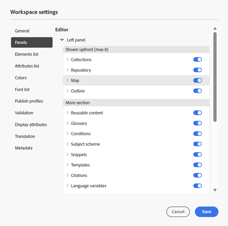 Panels: This setting controls the panels that are shown in the left and right panels of the Editor and Map console. You can toggle the button to show or hide the desired panel.