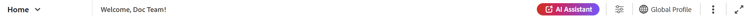 The header bar is the top bar of the Home page that displays the Adobe Experience Manager logo (or a Unified Shell if you are using the Unified Shell as your Experience Manager Guides UI). When you select the logo, it directs you to the Experience Manager Navigation page.
